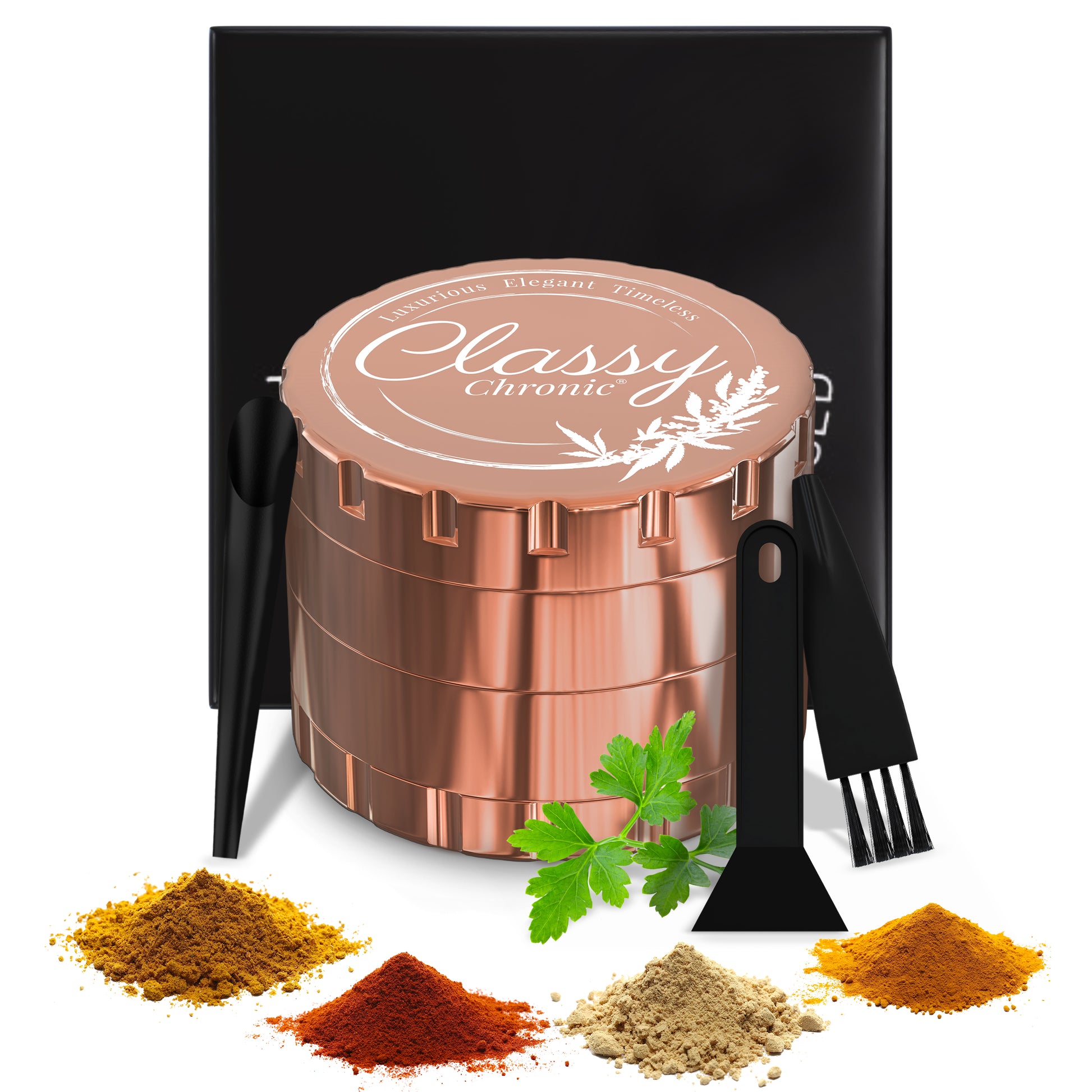 The Rose Gold Grinder is a limited-edition piece from ClassyChronic’s Signature Collection. With a luxurious rose gold exterior and a durable stainless steel interior, it’s as functional as it is beautiful. Perfect for those who want to make a statement while staying eco-friendly, this grinder is packaged sustainably and built to last.